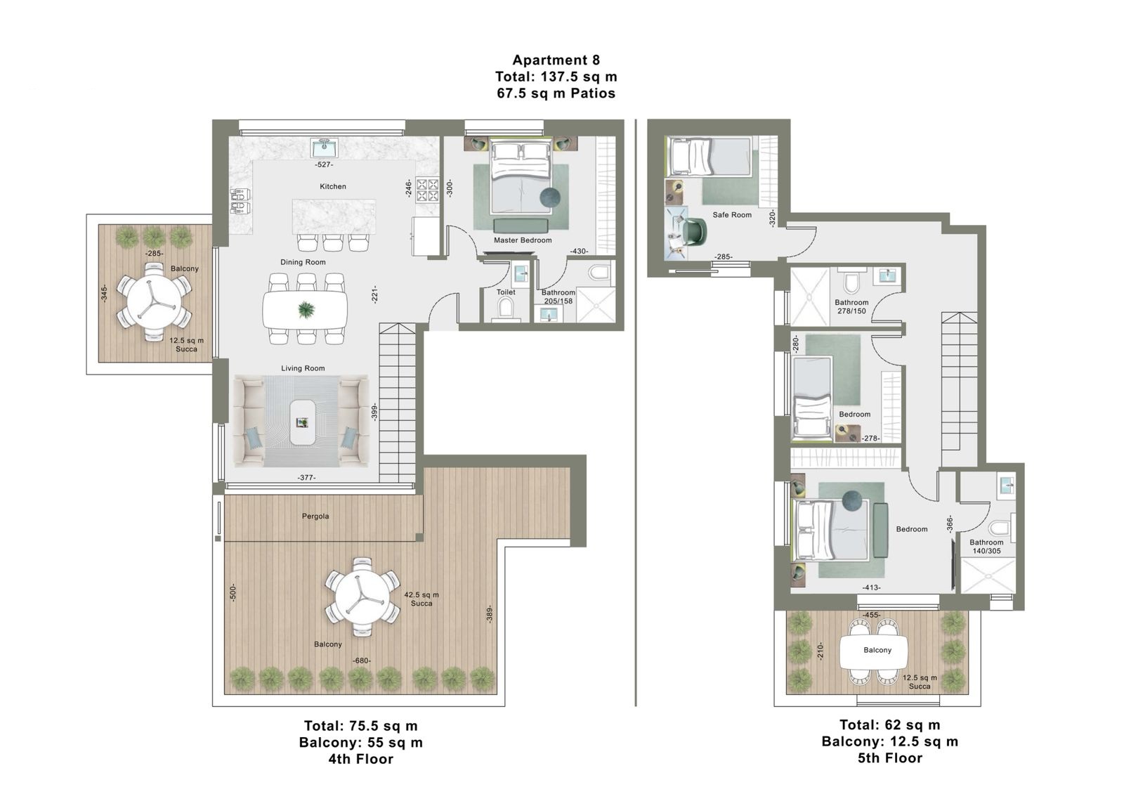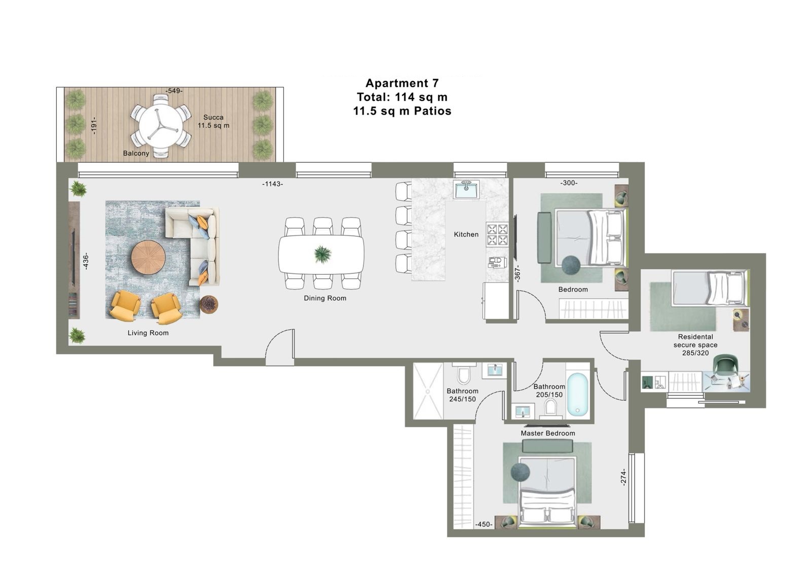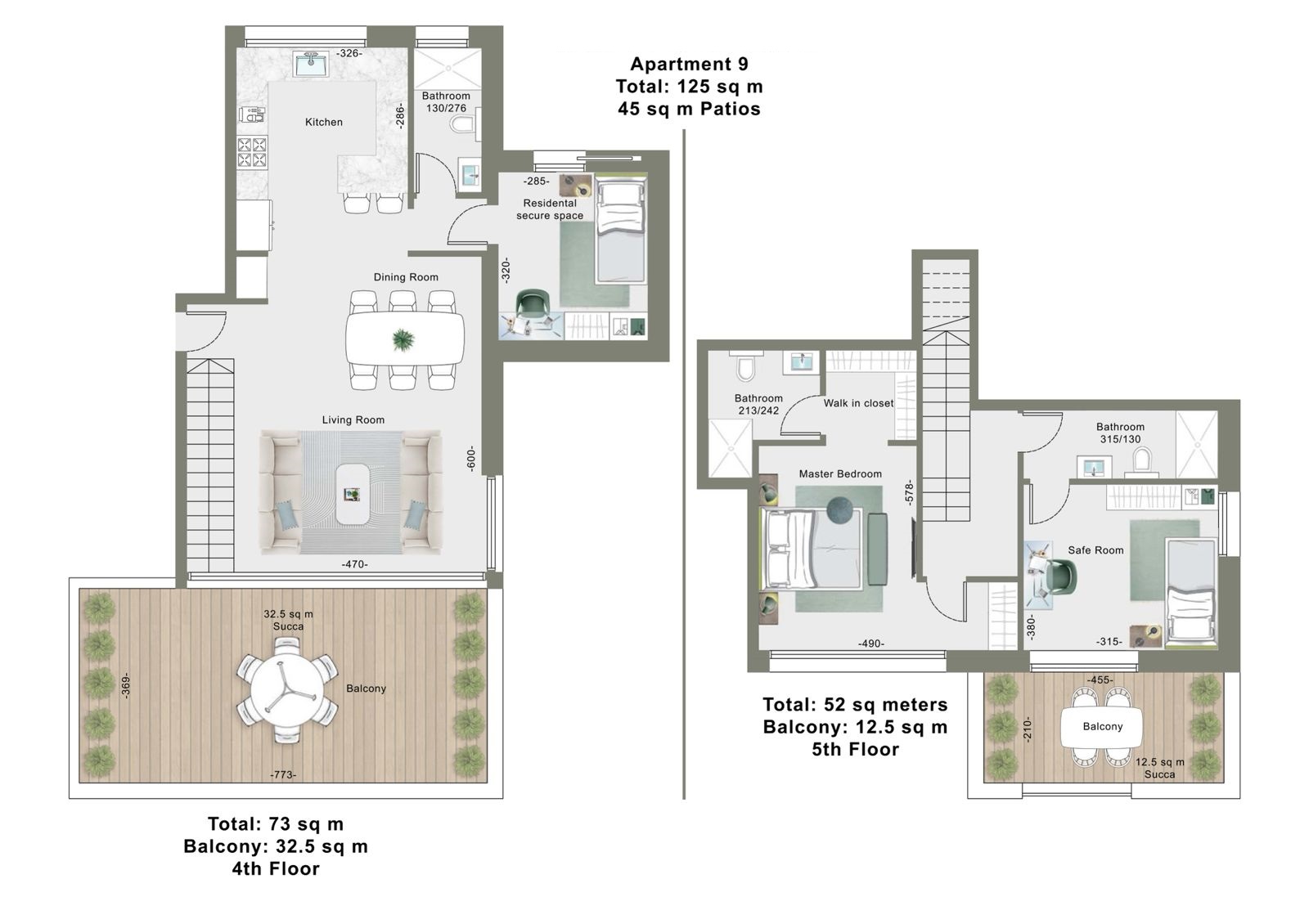 מפרט הדירות כולל מטבח בסטנדרט גבוה, מערכת חימום תת-רצפתי מתקדמת, מיזוג אוויר מרכזי אינוורטר וחניה פרטית.